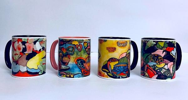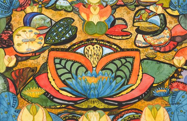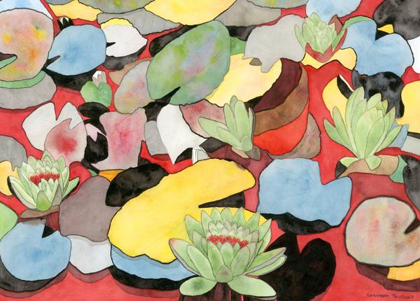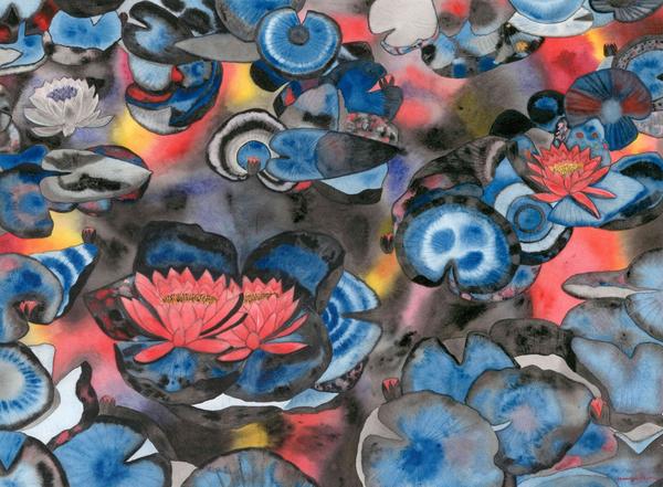 In my constant series of waterlily pods, I express my thoughts with warm and cool watercolours. The paintings are semi-abstract, like a collage of design objects.